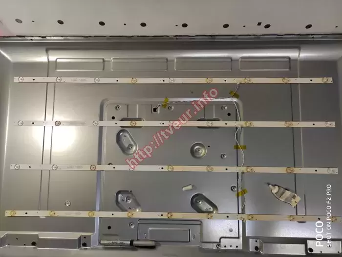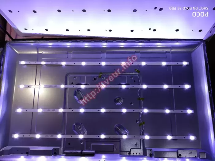 Внешне этот телевизор выглядит очень хорошо, практически как новый. В первую очередь его полностью разобрали. Это позволило узнать, что в данной модели имеются такие модули, как материнская плата (MainBoard) CV338H-T42. Непосредственно сама подсветка телевизора состоит из 4 линеек (планок), на каждой из которой расположено по 9 светодиодов. Выполненная диагностика (были протестировали все светодиоды) показала, что проблема в фонаре матрицы, из строя вышла нижняя планка ЛЕД подсветки, на которой перегоревшими оказались 6 светодиодов.