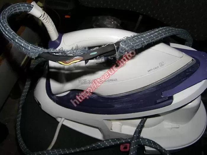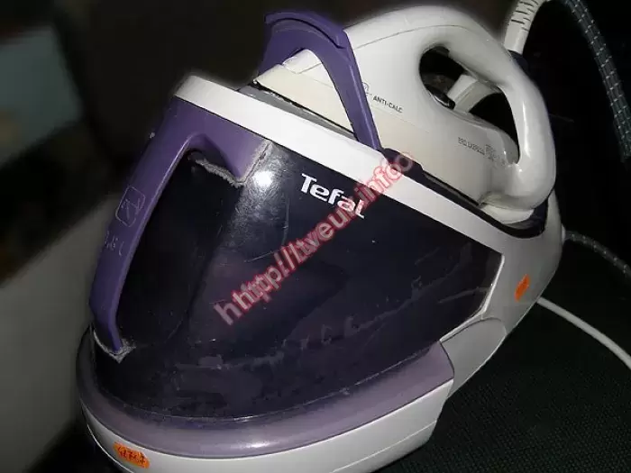 В утюге (парогенератор) Tefal GV 8330 +28238N после 2-3 минут нагрева не подается пар, кроме того, носик утюга сколот, система подачи воды и пара забита белым порошком, оплетка на шланге частично отсутствует, нет колпачка прикрывающего клапан, кнопки на панели управления стерты, шланг между бойлером и утюгом задубел, слабо качает насос. Чтобы выполнить ремонт утюгов необходимо было заменить насос TYPE B47 47W. Выполнена чистка системы подачи воды и пара, профилактика. Чтобы избежать ремонт в дальнейшем, провести предварительную глажку, в контейнер кроме воды ничего не наливать.