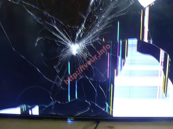 Первоначальный осмотр показал, что матрица разбита очень сильно, она вся в механических дефектах, а это значит, что потребуется заменить разбитый экран телевизора. Посередине матрицы образовался светящийся скол большого размера, от него в разные стороны многочисленные трещины. Они практически по всюду, в нижнем правом углу светлое большое пятно, на котором много разноцветных горизонтальных и вертикальных полос. В этом же месте появились вертикальные цветные столбцы. Пятно белого цвета появилось около верхней рамки, вниз от него широкая белая полоса. Еще несколько белых пятен около нижней рамки, непосредственно под сколом видны вертикальные полосы голубого цвета. Выполненная диагностика показала, что все внутренние составляющие телевизора в рабочем состоянии и при падении не пострадали. Результаты диагностики сообщили заказчику, который решил, что замена разбитого экрана телевизора будет целесообразным.
