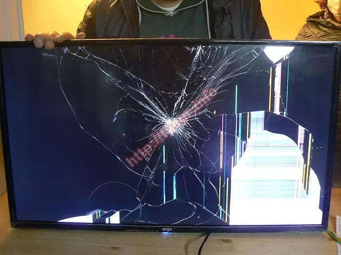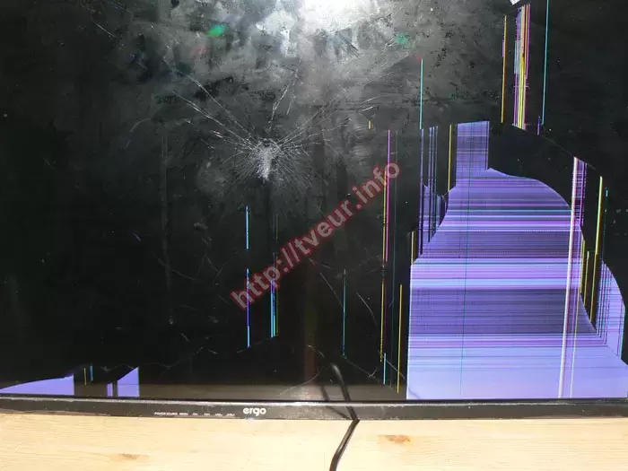 В телевизоре Ergo 32DH3004 достаточно серьезная неисправность, из-за падения с высоты у него разбита 32-дюймовая матрица, на которой появилось множество разных механических дефектов. Заказчик попросил заменить разбитый экран телевизора, а также проверить работоспособность всех остальных его составляющих, которые при падении также могли выйти из строя. Из рассказала клиента выяснили, что телевизор эксплуатировался на специальной тумбе, с которой его по неосторожности столкнули и он упал на пол. Ситуация усложнена тем, что на полу были разбросаны разные предметы, включая детские игрушки, на которые он упал. Когда телевизор подняли, то увидели, что на матрице есть достаточно большой скол, поэтому и возникли подозрения, что это негативно сказалось и на других компонентах.