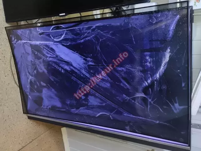 Матрица в телевизоре повреждена очень сильно, она вся в хаотичных разводах черно-синих цветов. С правой стороны также имеются разводы, но их цвет белый. На экране появились серые пятна, что может говорить о том, что в этих местах матрица отслоилась. Длинная и глубокая трещина проходит вдоль верхней рамки. Кроме того, стекло экрана было оторвано, и светофильтр также пострадал в результате сильного удара. В ситуации, что случилась возможна только лишь замена жидкокристаллического экрана. Результаты диагностики показали, что после падения другие элементы системы функционируют нормально.