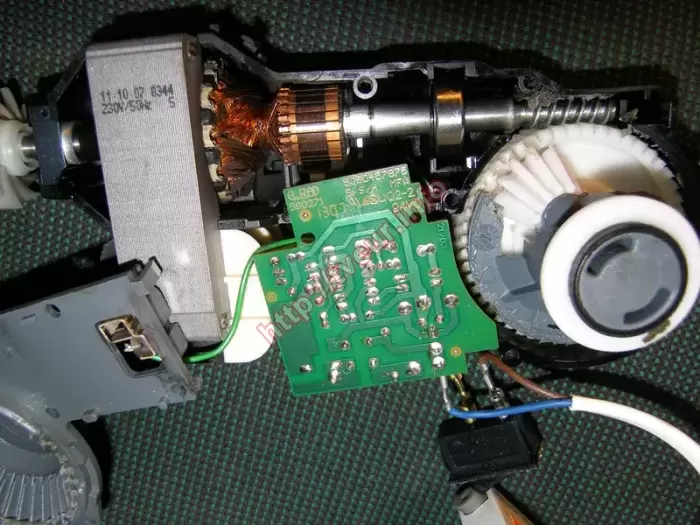 Электромясорубка Bosch MFW1501/05 с пластиковым корпусом и производительностью 1,5 кг/мин, остановилась во время работы, и больше не включается. Такая неисправность стала поводом обращения в наш сервисный центр, где всегда можно выполнить любой сложности ремонт электромясорубок. Данная модель с максимальной мощностью при блокировке двигателя 1000 Вт и номинальной мощностью 450 Вт. У нее отсутствует функция «Реверс». Состояние этой кухонной бытовой техники удовлетворительное, ее ножи требуют заточки, корпус немного грязноват. Причина неисправности предположительно состоит в том, что сработала защита от перегрузки. Это распространенная проблема, поэтому наши мастера точно знают, как ее решить. Во время выполнения диагностических работ установлено, что поломка в двигателе, также проблема в ножах. В данном случае ремонт электромясорубок состоял в восстановлении термозащиты. Также полностью доведены до нужного состояния ножи. Не лишней оказалась чистка устройства. Для того, чтобы стал возможным вышеописанный ремонт, мясорубку пришлось полностью разобрать (отлично демонстрирует фото № 5). Теперь устройство работает хорошо, оно включается, при этом пользователю рекомендовано проверить сетевое подключение, ножи сильно не зажимать, двигатель не должен притормаживать, а тем более останавливаться. Кроме того, мясорубку не перегружать!
