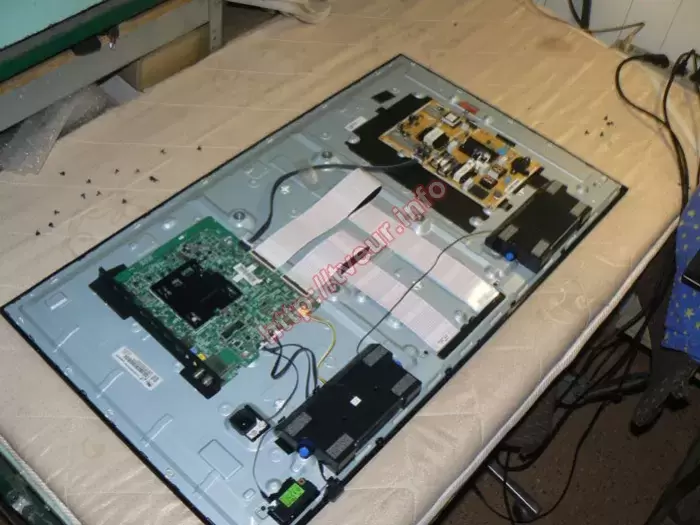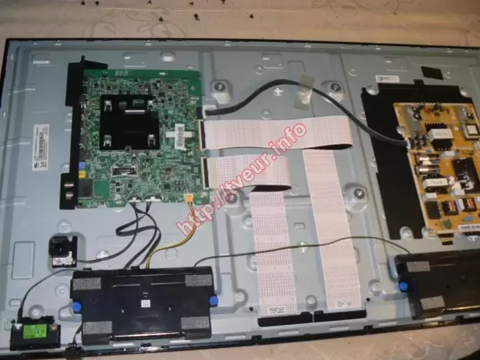 После разборки телевизора выяснили, что в нем используются такие составляющие, как матрица CY-GK040HGLV4V, шлейфы матрицы BN96-39891A, BN96-39823C, материнская плата (Main Board) BN41-02568B. Прежде чем оказать сервис по ремонту телевизоров была проведена углубленная диагностика, которая показала, что проблема достаточно серьезная, поскольку неисправна плата Main Board, на которой требуется перепайка разных радиодеталей. Поскольку данную плату возможно восстановить на компонентном уровне, ее замена не потребуется.