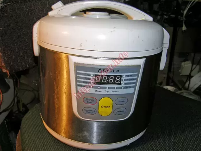 Мультиварка с пароваркой Delfa DMC-50 перестала включается, по этой причине заказчику необходимо, чтобы был осуществлен срочный ремонт мультиварок в нашем сервисном центре. Эта бытовая кухонная техника мощностью 900 Вт и чашей, объемом 5 литров, наделена электронным управлением. У нее 10 автоматических программ, имеется функция «Йогурт». К особенностям устройства можно отнести наличие LED-дисплея, а также возможность сохранения тепла до 24 часов. Данная мультиварка поступила к нам в неудовлетворительном состоянии, она очень грязная, причем, как внутри, так и снаружи, ее корпус весь в потеках и в жиру. Внутри она также зажирена, дисковый нагреватель очень сильно обугленный, сгорел термопредохранитель. Все эти симптомы говорят о том, что использовали прибор не правильно (не аккуратно), не проводили периодически чистку, а на дисковый нагреватель попадала жидкость. Поскольку из строя вышел дисковый нагреватель и плата питания, ремонт мультиварок был направлен на возобновление работоспособности данных модулей. Выполнено восстановление термозащиты, пропайка платы. Кроме того, заменены термопредохранитель 172* 10а 250в и две новые клеммы. После такого ремонта, данная мультиварка работает, при этом в дальнейшем стараться не допускать попадания какой-либо жидкости на дисковый нагреватель. Периодически за устройством ухаживать!