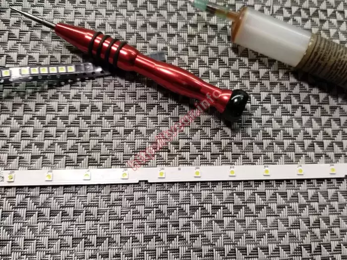 В данном случае на левой планке подсветки была выполнена перепайка всех LED светодиодов AOT 3030 6V 260mA 1,6W в количестве 14 штук. На правой стороне нижней подсветки все светодиоды светятся хорошо. Для более длительной работы подсветки телемастер выполнил ограничение тока питания. После вышеописанного ремонта подсветка равномерная по всему экрану, изображение отличного качества. Также проверены все настройки изображения и выставлен самый оптимальный их уровень. Это был ремонт с выдачей гарантии.