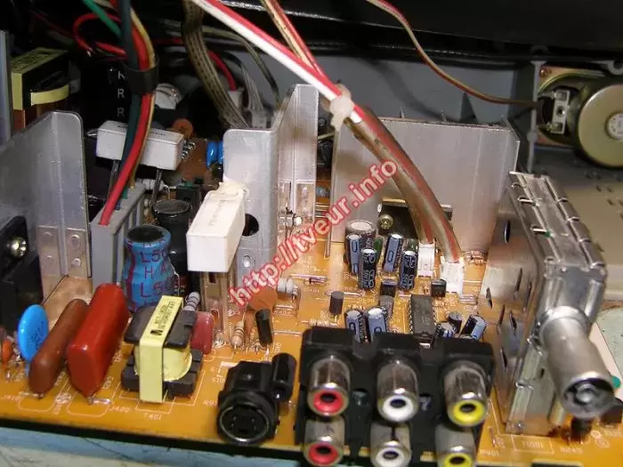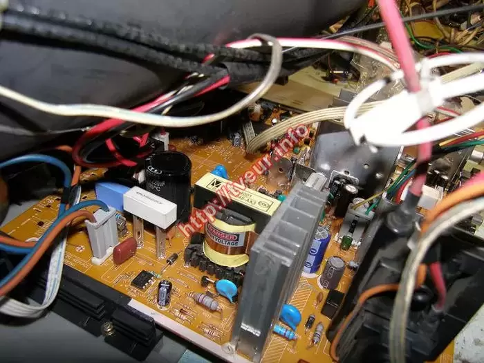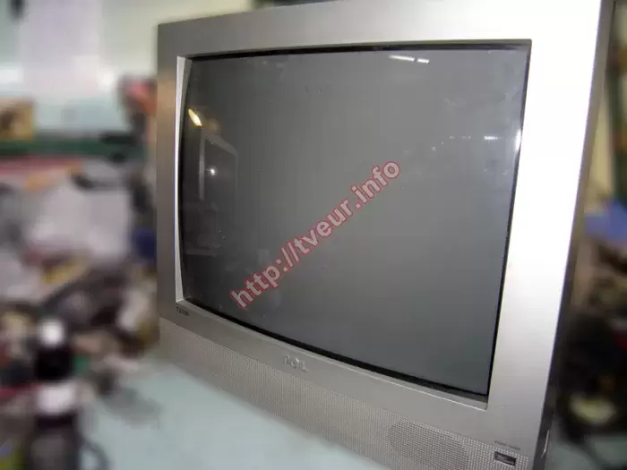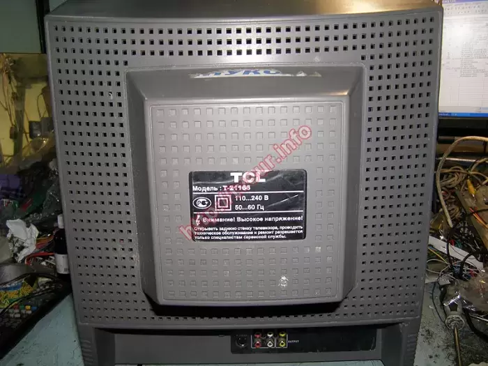 Устаревший телевизор TCL T21166 с экраном 54 см не включается, цыкает. Его пытались ремонтировать, неправильно установили детали строчной развертки. В результате прогорание ОС, при поиске неисправности перепутали местами кондеры в обратном ходе (0,39 мкФ воткнули в цепь коллектора СР). Поскольку проблема в модуле строчной развертки, ремонт телевизоров в его восстановлении. Кроме того, заменена отклоняющая система Samsung DSE-2092BL и MD 1803 DF. Выполнена регулировка сведения и геометрии, восстановлен монтаж, сделана профилактика. Это был сложный ремонт.