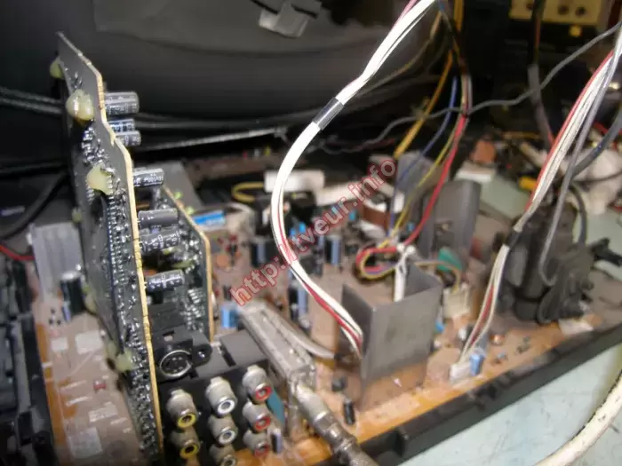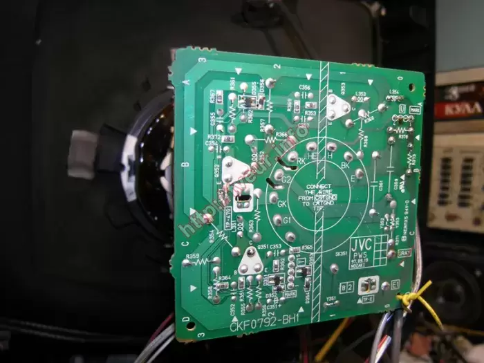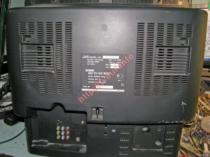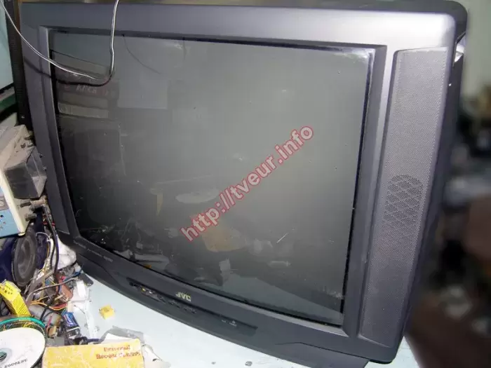 В кинескопном телевизоре JVC AV-2550TEE с экраном 63 см периодически ярко-белый растр без изображения, он отключается в защиту, не работает кнопка VOL-. С такой неисправностью, ремонт телевизоров будет сложным. Поскольку из строя вышли одновременно два модуля, а именно, строчной развертки и управления, необходимо было полностью возобновить их работоспособность. Помимо этого необходима замена многих деталей, таких как, микрик кнопки VOL-, C 4,7 * 250 В и других, что также было сделано. После выполненного ремонта, все неисправности исчезли, телевизор работает хорошо.