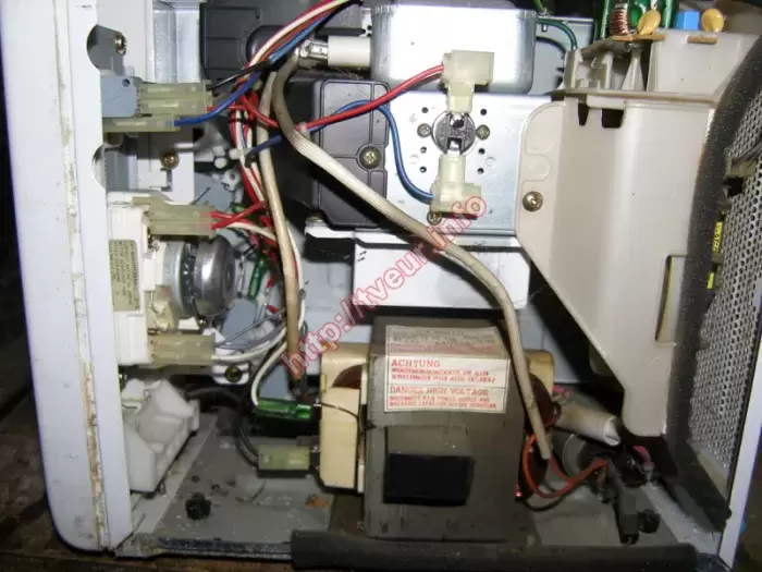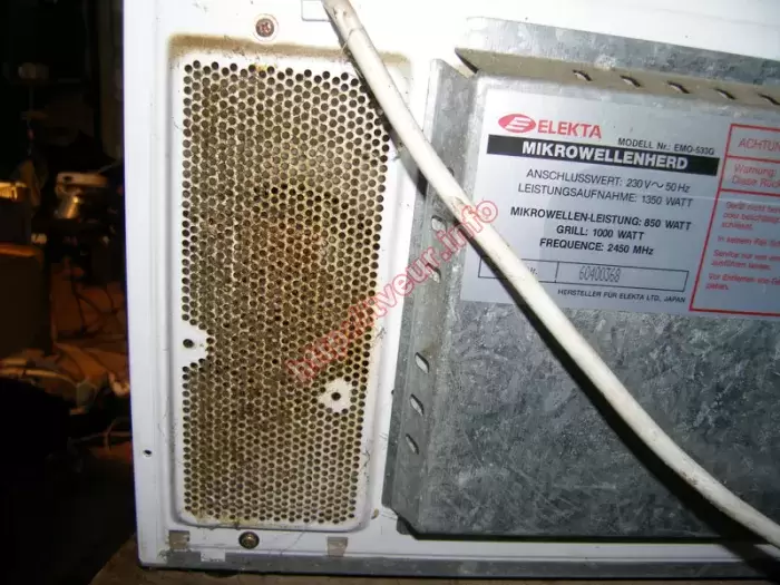 В микроволновке с грилем Elekta EMO-533G, которая изготовлена в Японии, плохо открывается дверца, сломана кнопка фиксации дверцы. Пользователь попросил, чтобы сделали срочный ремонт микроволновки. Устройство поступило в ужасном состоянии, внутренняя духовка очень зажирена, она грязная, есть тараканы (отлично видно на фото № 1). Кроме того, на решетке вентилятора собралась «шуба» из пыли и жира (фото № 2), слюда подгорела, в нише кнопки открытия собралась смесь из пыли и жира, поэтому, что-бы открыть дверцу надо применить силу, прокладка по периметру двери с внутренней стороны крошится и выпадает. Очевидно, что такое состояние усложняет выполнение ремонта микроволновки. Но это только внешнее состояние прибора, при этом чтобы разобраться в неисправности требуется диагностика, для чего СВЧ печь полностью разбирали (фото № 5). Как оказалось проблема одновременно в нескольких узлах. А именно, панели управления, волноводе, решетке вентилятора. Мастерами сделана чистка панели управления, также почищен волновод, решетки вентилятора, сделан ряд других профилактических работ. Пришлось заменить новую слюдяную пластину 110-65 мм. Это полностью решило проблему, при этом в дальнейшем за микроволновкой нужно ухаживать, в первую очередь, избавиться от тараканов, проветривать после приготовления блюд. В противном случае она опять очень быстро выйдет из строя, потребуется новый ремонт, который может оказаться не рентабельным. Об этом сообщено заказчику.