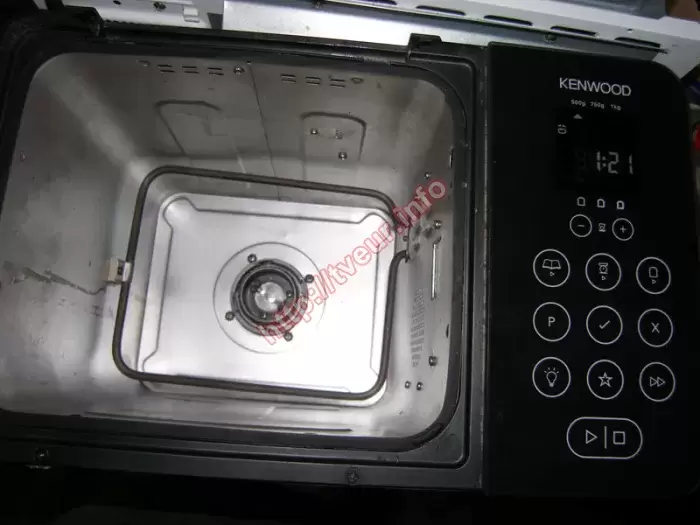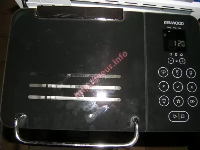 В хлебопечке Kenwood BM 450 нет нагрева, плохой замес, при замесе теста слышен скрежет. С такой заявленной неисправностью устройство поступило в наш сервисный центр, где всегда можно выполнить любой сложности ремонт хлебопечек. Эта кухонная бытовая техника отличается стильным элегантным дизайном, так как ее серебристый металлический корпус отлично сочетается с черной панелью управления и сенсорными кнопками. Мощность хлебопечки составляет 780 Вт, у нее имеется 15 автоматических программ, 3 варианта корочки (светлая, средняя, темная). В этой кухонной бытовой технике можно выпекать хлеб, весом до 1 кг. После предварительного осмотра сделан вывод, что в целом состояние хлебопечки удовлетворительное, поскольку корпус немного загрязнен, особенно это заметно на черной панели (фото № 1). При разборке прибора стало понятно, что во время приготовления джема, остатки просочились на редуктор (видно на фото № 2). В результате из строя вышли несколько модулей, а именно, редуктор, двигатель и плата питания. С такой неисправностью ремонт хлебопечек был достаточно сложным, при этом результативным, поскольку вышедшие из строя модули полностью восстановлены. Заявленная неисправность «нет нагрева» - не подтвердилась. Чтобы избежать ремонта в дальнейшем, стараться, чтобы во внутрь ничего не попадало. Кроме того, за устройством периодически ухаживать.