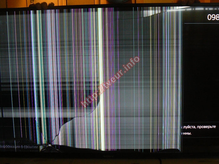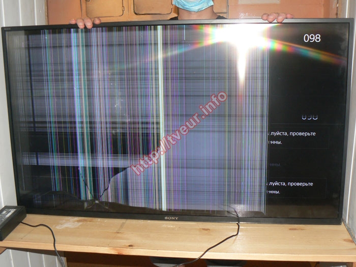 Телевизор получил сильные повреждения после того, как упал экраном вниз на тумбу. Слева от логотипа Sony образовалась заметная дырка, от которой расходятся трещины в разные стороны. Самая длинная трещина тянется до верхней рамки. Большая часть матрицы покрыта разноцветными полосами, как вертикальными, так и горизонтальными. Справа экран полностью черный, однако внизу еще видна часть подсветки заставки, а сверху тонкая горизонтальная светлая полоса с цифрой 098. Для проведения диагностики телевизор был подключен к нашему тестовому блоку питания. Проверка показала, что неисправна исключительно матрица, все остальные компоненты находятся в рабочем состоянии. Это означает, что для восстановления работоспособности устройства потребуется только замена разбитого экрана телевизора. Клиент полностью проинформирован о результатах диагностики и дал согласие на выполнение ремонта.