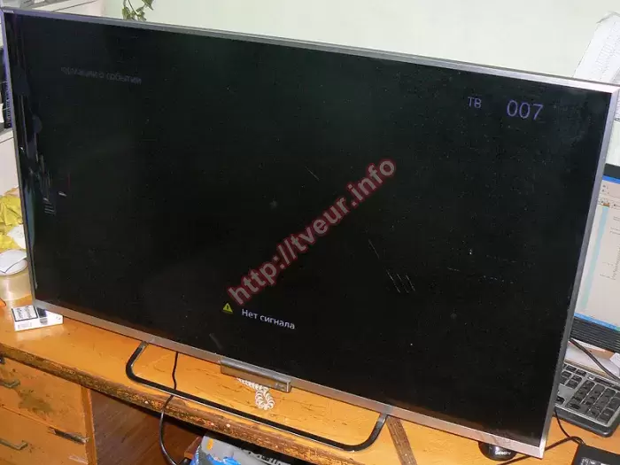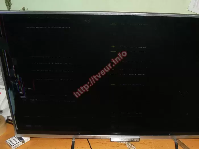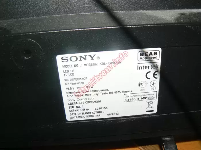 В 42-дюймовом LED телевизоре Sony KDL42W654, который собран в Словакии в 2013 году поцарапан экран, на нем видны другие механические повреждения. Исходя из этого необходимо срочно заменить экран телевизора, поскольку в данном случае возможен только такой ремонт. Эта модель с поддержкой самых современных функций, включая Smart TV и Wi-Fi. В целом телевизор в хорошем состоянии, при этом он поступил в сервисный центр вместе с ногой, а поскольку снять ее не возможно из-за, вышедшего из строя болта, поэтому его пришлось отпилить с помощью ножовки. Из-за сильного удара по матрице тяжелым предметом, возле левой боковой рамки образовались трещины, причем их достаточно много. Между трещинами много вертикальных и горизонтальных разноцветных линий. К нижнему левому углу от места удара растянулось пятно серого цвета, быстрее всего в этом месте произошло отслоение матрицы. Несколько тонких трещин появилось с другой стороны. По всему экрану полосы неизвестного происхождения, предположительно это остались какие-то надписи. Также видна заставка внизу и в правом верхнем углу. Чтобы заменить экран телевизора необходимо в первую очередь демонтировать разбитый, причем делать это нужно крайне осторожно, чтобы не повредить остальные составляющие телевизора. После этого установить новую деталь, а только потом выполнить все необходимые настройки. В данном случае замена была с положительным результатом, на которую вместе с новой панелью выдана гарантия.