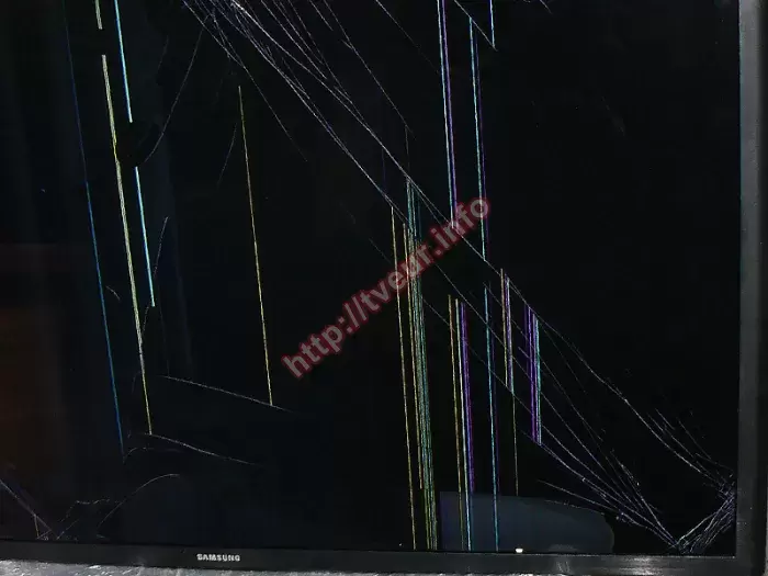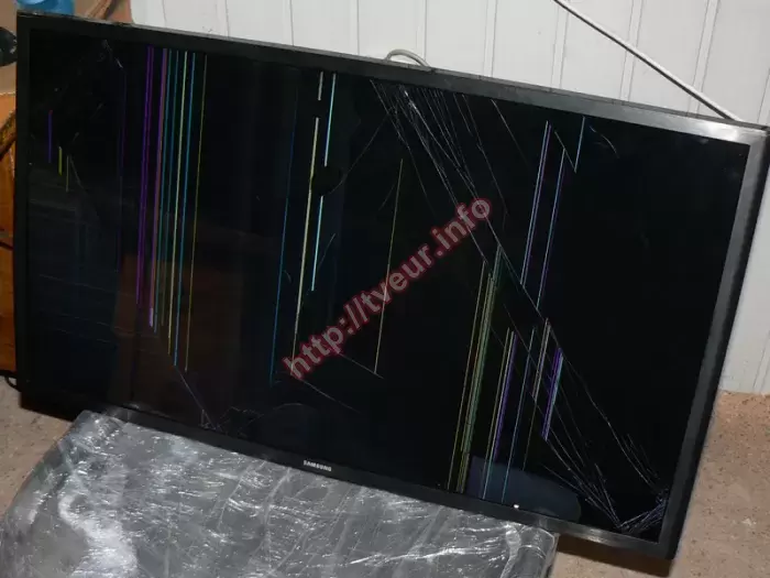 Современный Smart TV телевизор с LED подсветкой Samsung UE32J5200, собранный в 2017 году и поддерживающий функцию Wi-Fi, доставлен в наш сервисный центр из города Винница, поскольку у него очень сильно повреждена 32-дюймовая ЖК матрица. Заказчик завернул разбитый телевизор в покрывало и упаковал в коробку. Вместе с ним он также прислал ножки, блок питания, шнур, пульта дистанционного управления не было. В данном случае требуется срочная замена матрицы Самсунг, которую придется заказывать. По телефону от пользователя узнали то, что как оказалось, телевизор выходит из строя не в первый раз. Более года назад мастера нашей мастерской уже занимались заменой экрана в данном телевизоре (заказ №:70790). Тогда матрица Самсунг была сильно повреждена после падения телевизора на пол, на ней образовались трещины, вмятины и другие механические повреждения. После результативной замены клиент не сделал соответствующих выводов. Телевизор опять использовался на той же тумбочке. По прошествии времени его опять по неосторожности сбросили на пол и он опять рухнул панелью вниз. Это повлекло возникновение большого количества дефектов. Правый нижний угол пострадал больше всего, здесь образовалась сетка из трещин, от нее пошло много трещин, которые заканчиваются возле верхней рамки посередине (видно на фото №1 и 2). Не менее пострадал верхний левый угол, здесь трещины прошли до середины нижней рамки. Наряду с трещинами по всему экрану многочисленные разноцветные полосы, видны пятна черного и серого цвета. При падении рамка осталась целой, на ней повреждений нет. У нас получилось заказать и купить новую панель, подходящую по всем параметрам. Только потом была снята разбитая и выполнена замена матрицы Самсунг. После этого сложного и дорогостоящего ремонта, на который выдана гарантия, рекомендовано установить телевизор более надежно.