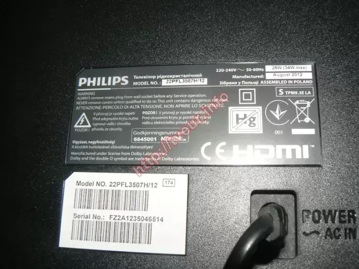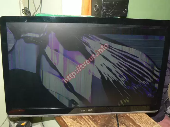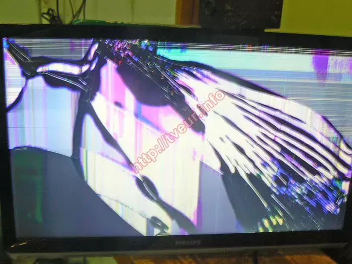 В 22-дюймовом LED телевизоре Philips 22PFL3507/12 с поддержкой функции Smart TV, который собран в Польше в 2012 году, после падения экран больше напоминает «северное сияние», на нем видны все цвета радуги. Поскольку мы знаем, как заменить матрицу на телевизоре, пользователь доставил его в сервисный центр. После предварительного осмотра стало понятно, что панель безнадежно испорчена, на ней огромное количество трещин, которые по всему экрану. Кроме того, матрица состоит из разноцветных пятен неопределенной формы, также появилось много полос разных цветов, причем как вертикальных, так и горизонтальных. В левом нижнем углу царапина на рамке, которая отлично читается на черном фоне (можно увидеть на фото № 2). Но это еще не все проблемы, возникшие в результате падения. Проведенная диагностика показала, что неисправна плата Main Board, ее работу восстановить не возможно. Исходя из этого требуется ее замена. Этот телевизор со встроенным цифровым тюнером DVB-C/T для приема цифрового кабельного телевидения, наделен тремя входами HDMI и еще двумя USB разъемами для воспроизведения мультимедийного содержимого. Так как заменить матрицу на телевизоре достаточно сложно, данным ремонтом занимались опытные телемастера. Вначале была демонтирована испорченная, на ее место установлена новая панель, которую пришлось заказывать. Также заменена новая плата Main Board. Сделаны все настройки. Это был сложный, дорогостоящий, при этом результативный ремонт. Заказчику выдана гарантия.