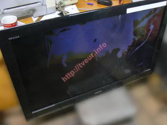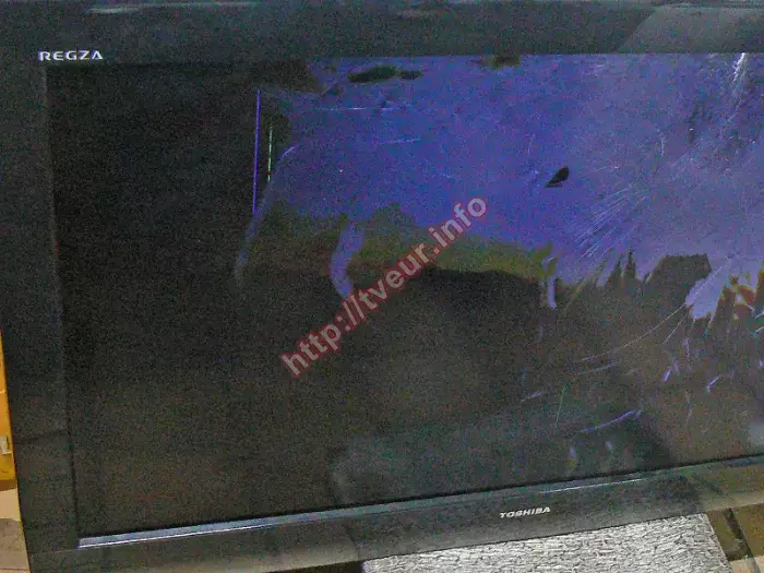 В сервисный центр поступил 40-дюймовый LCD телевизор Toshiba 40LV733G1, у которого после падения очень сильно повреждена матрица, на ней многочисленные механические повреждения. А это значит, что сложная и дорогостоящая замена матрицы для телевизора станет неизбежной. На приемке заказчик рассказал, что телевизор был установлен в комнате на тумбочке, его нечаянно задели и он упал вниз экраном. Он был во включенном состоянии, но когда устройство подняли, на экране кроме черного цвета и различных повреждений больше ничего не было. Данная модель наделена уникальной технологией AutoView, с помощью которой в автоматическом режиме подстраиваются настройки изображения, причем не только с учетом уровня освещенности помещения, но так же в соответствии с тем, что на данный момент транслируется по телевизору. Устройство с хорошим углом обзора 178°, яркостью экрана 450 кд/м2 и динамической контрастностью 4000000:1. Телемастер осмотрел устройство и сделал заключение, что в результате падения большая часть матрицы отслоилась, в данном месте образовалось большое серое пятно, которое возле верхней рамки и доходит практически до середины. Здесь же место удара, от которого паутина из мелких трещин. Кроме того, трещины расползлись по всему экрану. С левой стороны две короткие вертикальные цветные полоски. Такой ремонт, как замена матрицы для телевизора может быть выполнена только после того, как будет заказана новая деталь с учетом модели и версии. После этого выполняется демонтаж испорченной панели, только потом устанавливается новая. После результативной замены сделаны все настройки.