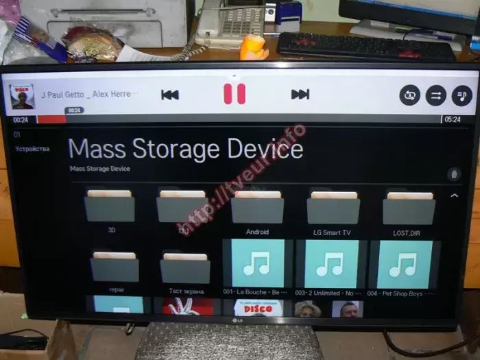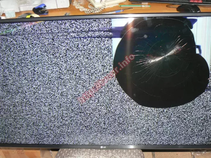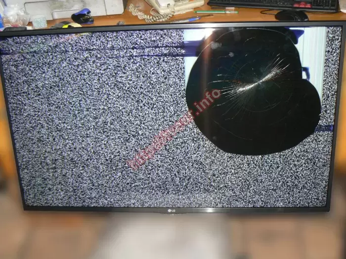 В 3D телевизоре LG 42LF620V очень сильные механические повреждения на 42-дюймовой LED матрице. В данном случае возможна только замена матрицы в телевизоре LG, которая будет не только сложной, но и дорогой. Такого рода неисправности появляются в результате не аккуратного использования, когда по матрице был удар или телевизор упал на пол. В данном случае в экран попали тяжелым и острым предметом. Как результат на нем появились разного рода дефекты. От места удара, который пришелся в правый верхний угол, разошлись множественные тонкие светящиеся трещины разной длины. Еще несколько круговых трещин образовали большое черное пятно (отлично видно на фото). По обе стороны от черного пятна матрица серого цвета, на ней просматриваются вертикальные цветные линии и еще смазанное темно синее горизонтальное пятно. Остальная часть панели покрыта серой рябью. Чтобы стала возможной замена матрицы в телевизоре LG, в первую очередь ее необходимо заказать. Причем новая матрица должна подходить по всем параметрам. Только потом телемастера максимально аккуратно сняли разбитую матрицу, а на ее место установили ту, которую купили. Она полностью подошла, поэтому после выполненных настроек изображения на экране отличного качества (см. фото № 4). На ремонт по замене и новую деталь заказчику дана гарантия, а еще ряд рекомендаций по дальнейшей эксплуатации телевизора.