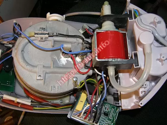 В утюге с парогенератором Delonghi STIRELLA PRO1860X постоянно горит индикатор отсутствия воды в утюге, при ее наличии, возможно геркон потерял свои свойства. Внешне состоянии утюга хорошее, его вскрывали, в итоге сломали два держателя (винты принесли в кулечке). Мы беремся за ремонт утюгов, а поскольку из строя вышла плата коммутации, мы ее восстановили, также почистили систему подачи воды и пара, выполнили профилактику. Заказали и поменяли геркон 9в. Использовали средство от накипи. Выполнив ремонт, пользователю рекомендовано провести предварительную глажку.