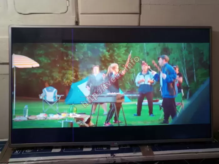На 42-дюймовой матрице телевизора LG 42LF5800 появился дефект в виде вертикальной светлой полосы, которая поверх изображения, что создает определенный дискомфорт при просмотре. Основываясь на многолетнем опыте, предположительно потребуется ремонт матриц телевизоров, о чем нельзя утверждать без проведенной диагностики. На приемке заказчик рассказал, что после покупки телевизор установлен на стене, он эксплуатируется максимально аккуратно и бережно, поэтому что стало причиной возникновения неисправности он не знает. Кроме того, от него узнали, что это первая неисправность, телевизор с заводскими пломбами, так как его еще не раскрывали.