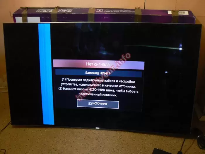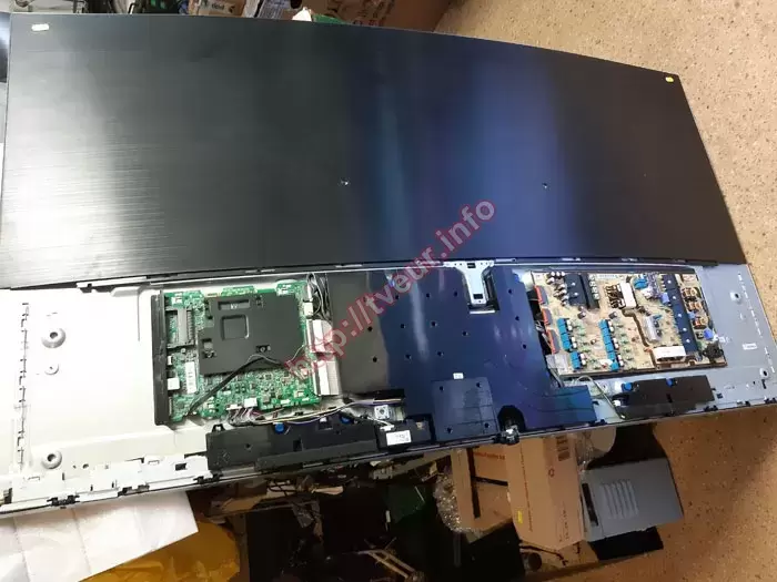 Телевизор Samsung UE65KS9000 поступил в нашу мастерскую из г. Кропивницкий, упакованным в родную коробку вместе с выносным модулем и шнуром. По телефону заказчик сообщил, что в работе телевизора произошла проблема, а именно, на матрице с левой стороны достаточно широкая голубая вертикальная полоса. Поскольку она сверху на изображении, просмотр телевизора практически не возможен. Также от него узнали, что телевизор приобретен около 6 лет назад, при этом все это время работал хорошо. Когда проявилась неисправность он сразу же обратился в мастерскую в своем городе, но там сказали, что предположительно требуется ремонт матрицы телевизора Samsung, возможно потребуется замена определенных компонентов, потому в предоставлении услуги отказали.