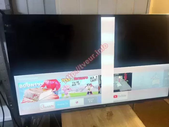 Когда телевизор включили непосредственно в сервисном центре стало понятно, что посредине изображения на экране появилась широкая вертикальная полоса белого цвета. округ полосы наблюдается легкое белое свечение. Рамка внизу пропалена, но это не будет влиять на разборку телевизора для проведения диагностических работ. В ходе диагностики выяснилось, что проблема заключается в дешифраторах, неисправны кое-какие элементы матрицы. Именно это и стало причиной появления вышеописанного дефекта. При такой поломке ремонт LCD матрицы может заключаться в том, что потребуется замена неисправных деталей, поскольку восстановить их не предоставляется возможным. Такой ремонт относится к категории сложных. По телефону заказчика ознакомили, как будут выполняться восстановительные работы и ориентировочную цену, на что получили от него одобрение.
