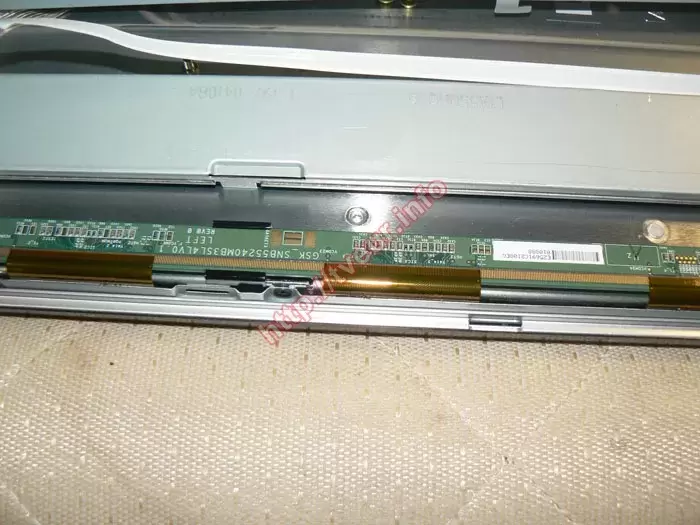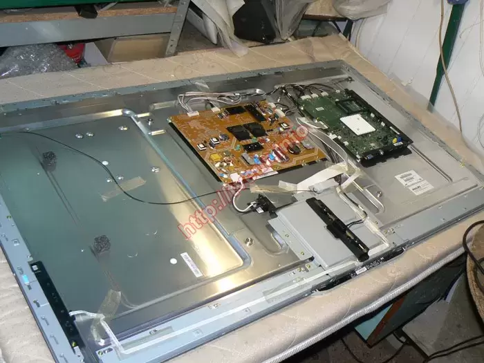 Внешнее состояние телевизора достаточно хорошее, при этом при включении изображения нет, но на матрице просматриваются полосы темного цвета. В первую очередь телевизор разобрали и выяснили, что в нем используются материнская плата 3104 313 65554A с тюнером SUT-RE214AN, плата T-CON E88441, плата GSK_SNB55240MB3SL4LV0.1, матрица LTA550HQ19. Выполненная диагностика показала, что из строя вышла матрица, поэтому имеются все основания для выполнения ремонта матрицы ЖК телевизора. Заказчик поставлен в известность о том, что для устранения такой неисправности потребуется замена элементов матрицы, восстановить которые не предоставляется возможным.