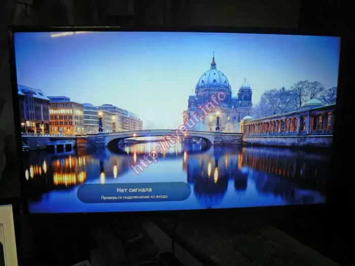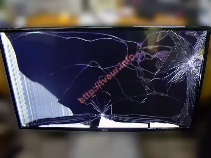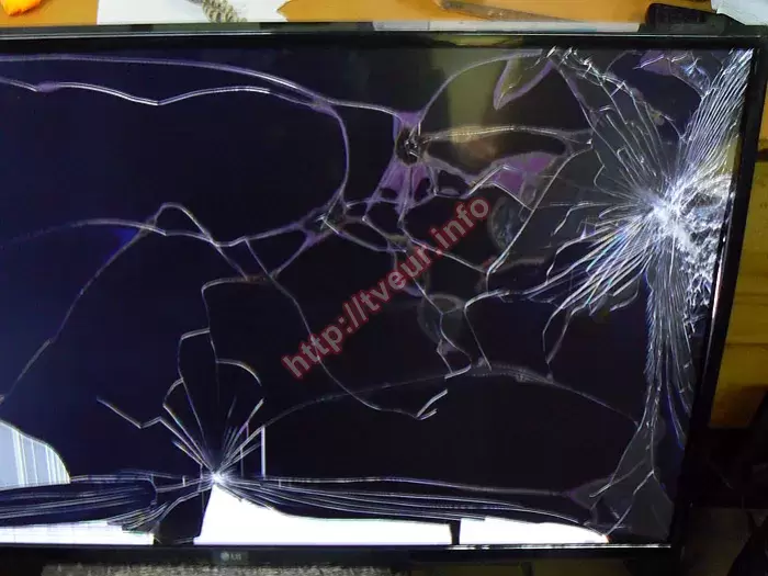 Матрица телевизора повреждена очень сильно, возле правой боковой рамки образовался большого размера светящийся скол, от которого в разные стороны множество мелких трещин, которые тоже светятся. Еще один скол, но меньшего размера посередине над логотипом LG. От него также в разные стороны много трещин разной длины. Вдоль всей нижней рамки пятно белого цвета. По всей матрице длинные глубокие трещины, между которыми серо-фиолетовые пятна (вероятно произошло отслоение матрицы). С левой стороны большое светлое пятно, на котором просматриваются вертикальные полосы. Очевидно, что в данной ситуация возможна только замена матрицы в телевизоре.