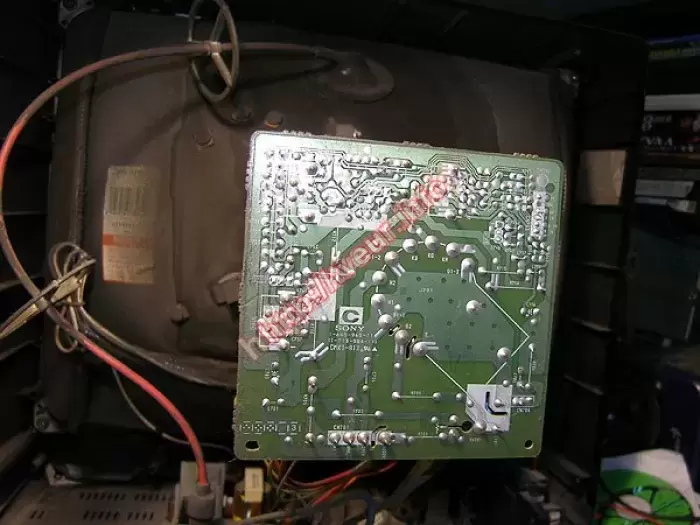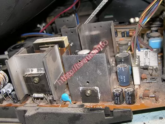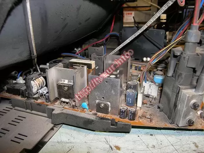 Когда кинескопный ТВ отключается в защиту чаще всего проблему стоит искать в модуле кадровой развертки, либо блоке питания. В данном случае ремонт телевизоров состоял в замене микросхемы LA7830, конденсатора С 100,0 * 50 В.