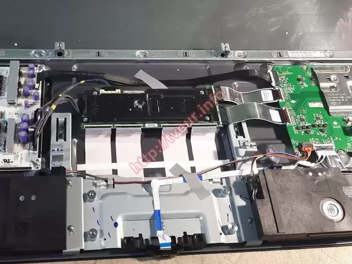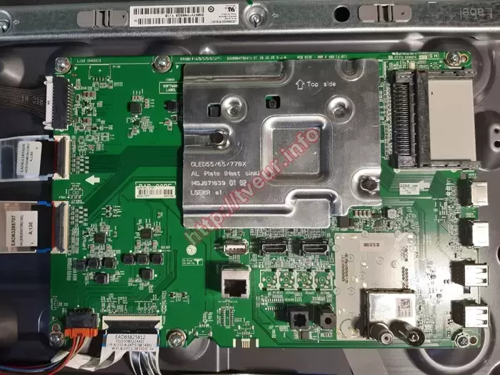 Для проведения диагностики и последующего ремонта телевизора потребовалась его аккуратная разборка. Поскольку устройство оснащено ультратонкой OLED-матрицей, чувствительной к механическим воздействиям, с корпусом нужно было обращаться максимально осторожно. Сначала телевизор отключили от электросети и разместили экраном вниз на мягкой ровной поверхности, чтобы предотвратить возможные повреждения. По периметру задней панели расположены винты разной длины, которые были аккуратно выкручены. После их снятия удалили нижнюю декоративную панель, которая удерживает часть крышки и скрывает дополнительные винты. Задняя крышка фиксируется не только винтами, но и защелками, поэтому ее осторожно поддевали пластиковым инструментом, начиная снизу. Основные модули телевизора размещены в нижней части корпуса: материнская плата EAX69047304(1.0) находится справа, блок питания слева, а шлейфы EAD65825812, EAD63285706, EAD63285707 и динамики - внизу. Проведенная диагностика выявила сложную неисправность - выход из строя материнской платы. В данной ситуации потребуется дорогостоящий ремонт телевизоров LG в Киеве и перепрошивка устройства, о чем сообщили заказчику, который дал согласие на проведение работ.