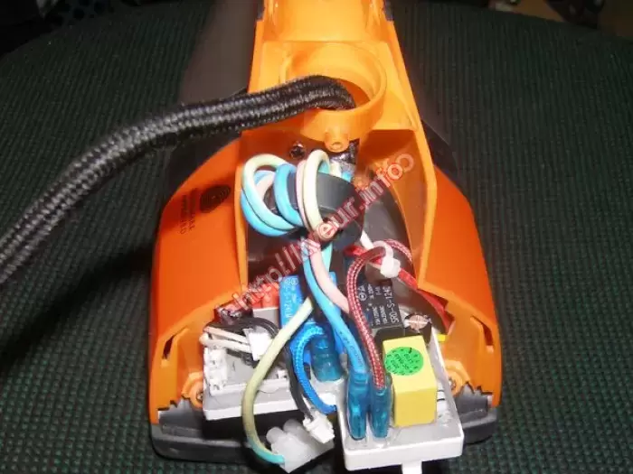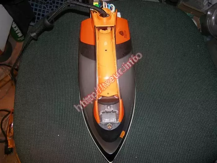 В утюге с парогенератором Bork I600 мощностью 2400 Вт при включении нет нагрева, пользователю необходим срочный ремонт утюгов. После осмотра утюга было выяснено, что модель достаточно прогрессивная, в ней есть электроника, помпа, бойлер, как в настоящем парогенераторе. Поскольку проблема в подошве, ее нужно было отреставрировать. Кроме того, сгорел термопредохранитель. В данном случае было выполнено восстановление термозащиты нагревательного элемента в подошве. Также пришлось менять новый термопредохранитель 230* 10а 250в и две клеммы. После ремонта, этот утюг греется.