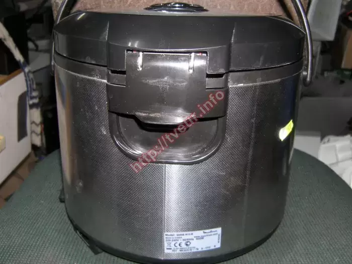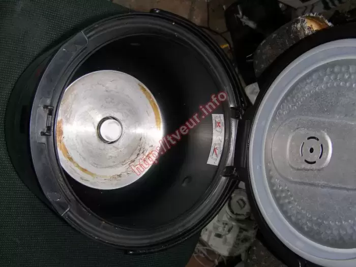 Пользователь мультиварки Moulinex MK302E30 Serie R13-B обратился в сервисный центр с заявленной неисправностью - при включении постоянно высвечивается ошибка Е0. По этой причине требуется срочный ремонт мультиварки, но чтобы его правильно выполнить необходимо провести предварительную диагностику, с помощью которой можно узнать, какая причина выхода из строя данного устройства. Она показала, что случился обрыв провода термодатчика в крышке. Кроме того, мультиварка немного грязная, дисковый нагревать начал прогорать, так как на него систематически попадала жидкость (видно на фото № 2). Данная модель с чашей, у которой антипригарное покрытие, она рассчитана на 4,5 литра. Управлять мультиваркой легко и просто, она наделена электронным управлением и LED-дисплеем. Мощность устройства составляет 600 Вт, в нем можно сварить кашу, рис, гречку, приготовить плов, суп, испечь хлеб или бисквит, сварить блюда на пару. Для выполнения ремонта мультиварки потребовалось полностью разобрать крышку. После того, как было восстановлено термоуправление, нагрев начинается через минуту после включения. Во избежание ремонта в дальнейшем, пользователю рекомендовано периодически за устройством ухаживать, не допускать попадания жидкости на дисковый нагреватель.
