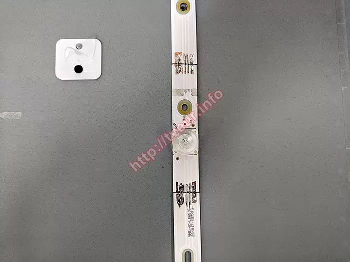 Прежде чем выполнять ремонт ЛЕД подсветки необходимо убедиться, что именно она стала причиной неисправности. После разборки телевизора выяснили, подсветка состоит из 10 стринг, которые в данной модели расположены в вертикальном положении, на каждой из них напаяно по 6 светодиодов. В ходе диагностики выяснили, что при предыдущем ремонте ЛЕД подсветки вырезали неисправный светодиод вместе с куском планки, а вместо него напаяли новый. Кроме того, сверху на дорожки напаяли провода. После тестирования всех светодиодов сделано заключение, что необходима замена целого комплекта подсветки. Это вызвано тем, что на каждой стринге имеются сгоревшие светодиоды, при этом некоторые из них уже на грани сгорания. Многолетний опыт показывает, что перепаивать все неисправные светодиоды нет смысла, рентабельнее будет замена всей ЛЕД подсветки.