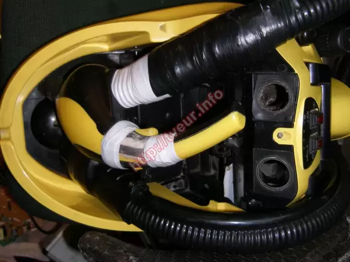 Пылесос премиум-класса KARCHER SV 1802 с парогенератором, предназначен для выполнения сухой уборки, а также сбора воды. Ним можно освежить ковры, убрать любые напольные покрытия. В устройстве с мощностью 2300 Вт установлен фильтр НЕРА 12, с помощью которого задерживается даже самая мелкая пыль, способная вызывать аллергию. Пользователь принес этот пылесос в наш сервисный центр, чтобы мы выполнили ремонт пылесосов, поскольку при включении слышен сильный гул и свист. Устройство в удовлетворительном виде, пользователь самостоятельно его разобрал, пытался ремонтировать, но у него ничего не получилось, в результате шланг перемотан изолентой (отлично видно на фото № 2). Кроме того, в двигателе развалились подшипники, устройство без контейнера и фильтров. Как показывает практика, с такой неисправностью ремонт пылесосов будет состоять в замене нового двигателя E 064200011, который достаточно дорогостоящий. Исходя из этого вынесено решение об замене подшипников на двигателе. В результате удалось спасти двигатель, путем замены на нем двух подшипников 22-8-7. Это был достаточно сложный ремонт, при этом теперь пылесос полностью рабочий. Пользователь предупрежден о том, крайне не рекомендуется заниматься самостоятельным ремонтом бытовой техники, поскольку не имея опыта, можно навредить еще больше, и данный случай хорошее тому подтверждение.