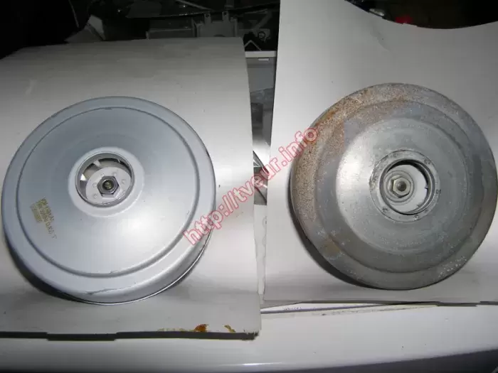 В пылесосе Samsung VC-7415V для сухой уборки появился запах горелого, во время работы слышен сильный гул. С такой неисправностью возможен ремонт пылесосов, при этом определить, насколько он будет сложным, можно во время диагностики. Эта обычная модель для выполнения сухой уборки, с мощностью 1500 Вт, мощностью всасывания 350 Вт, регулятором мощности на корпусе, 6-ступенчатой система фильтрацией. Как оказалось во время ремонта, этим пылесосом выполняли уборку, собирали цемент, другой строительный мусор. Кроме того, ним пытались производить влажную уборку. В результате ремонт пылесосов станет неизбежным, более того, он будет сложным и дорогостоящим. Внутри устройство сильно запылено и грязное (отлично видно на фото № 2). Кроме того, как показала диагностика, из-за цемента и попадания влаги, из строя вышел двигатель (см. фото № 4). В данном случае возможна только его замена, поэтому заказан и заменен новый двигатель VCM-K40HU. Также выполнена общая чистка этого пылесоса. Это был результативный ремонт, работа этой бытовой техники возобновлена. В дальнейшем использовать пылесос строго по назначению, цемент и строительный мусор не убирать, влажную уборку не производить, своевременно очищать мешок и фильтры.