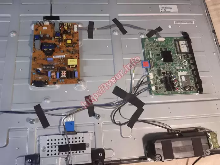 Первоначальный осмотр показал, что замена экрана телевизора будет обязательной, так как по причине достаточно сильного удара на нем появилась дырка (ближе к верхнему правому углу). Вокруг дырки множество небольших по длине трещин. В этом же месте появилось несколько трещин по кругу и большого размера пятно белого цвета. Наряду с вышеописанными дефектами на матрице много вертикальных и горизонтальных линий. Выполненная углубленная диагностика показала, что замене подлежит только матрица LA62M55T120V12, материнская плата NC4_M_TU24, ТВ тюнер EBL61240503 и другие компоненты телевизора при ударе не пострадали.