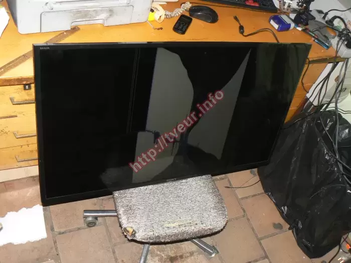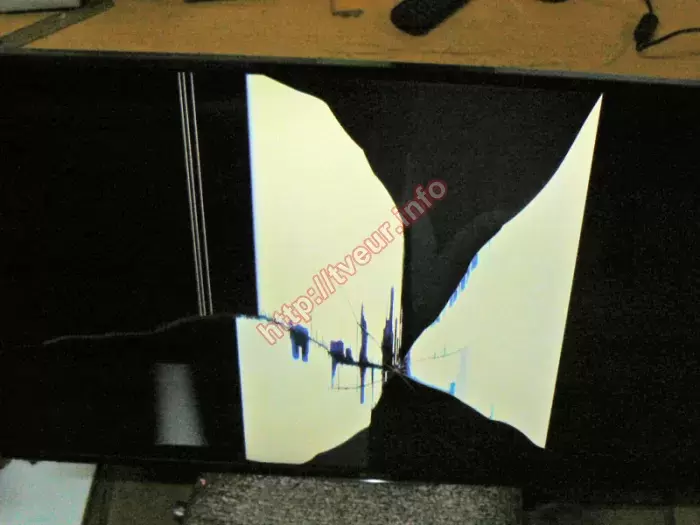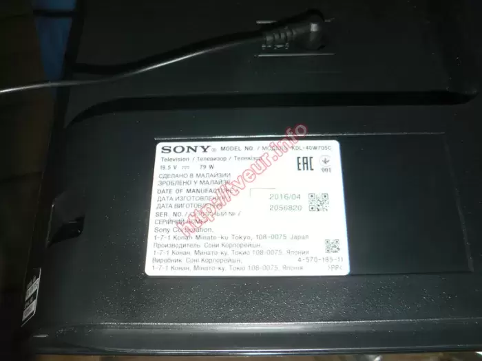 В жидкокристаллическом LED телевизоре Sony KDL-40W705C пробита 40-дюймовая панель. Это привело к тому, что на ней появились разного рода повреждения. Данная модель, собранная в Малайзии в 2016 году, поступила в сервисный центр из города Винницы, чтобы была выполнена замена панели телевизора. Этот ТВ с разрешением 1920x1080 точек, частотой развертки 200 Гц, дополнен технологией Motionflow XR. За акустику отвечают 2 стереодинамика мощностью 5 Вт каждый, имеется технология объемного звучания Dolby Digital. При этом главным достоинством телевизора является поддержка таких функция, как Smart TV и Wi-Fi. Матрица пробита чуть выше логотипа, от этого места во все стороны длинные толстые трещины. Между трещинами образовались сине-черные пятна, что особенно видно на белом фоне больших пятен, которых три, и визуально они напоминают цветок. Левее видно три вертикальные белые полосы. Остальная часть экрана залита черным цветом (отлично видно на фото № 2). Ранее этот телевизор не ремонтировался и не вскрывался, он в хорошем состоянии. На задней стенке имеются все этикетки от производителя, которые хорошо читабельные. С такой неисправностью возможна исключительно замена панели телевизора, которую необходимо купить. Потом телемастер снял испорченную деталь, а на ее место установил новую, после чего выполнил все необходимые настройки. После замены новой панели изображение на экране отличного качества. Пользователю выдана гарантия. Рекомендуем в дальнейшем пользоваться более аккуратно!