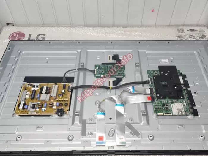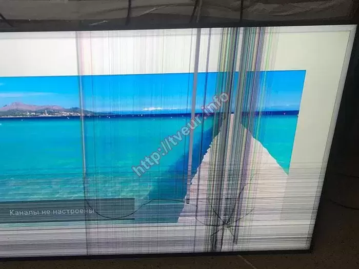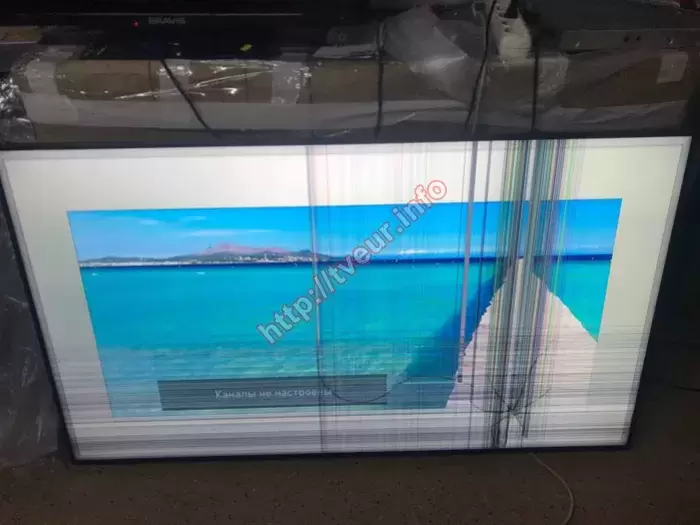 Выяснилось, что матрица действительно получила серьезные повреждения, так как в зоне удара, расположенной ближе к нижней рамке, образовалось отверстие внушительного размера. От него расходятся короткие, но глубокие трещины, а одна из них тянется почти до центра экрана. На месте повреждения заметны многочисленные вертикальные линии разных цветов, а немного левее ярко выраженные цветовые столбцы. Также по нижней части экрана проходят горизонтальные полосы, а в центре продолжает отображаться сообщение «Каналы не настроены». Для того чтобы стала возможной замена панели телевизора LG, устройство было полностью демонтировано. В ходе разборки установлено, что в конструкции использованы компоненты: LCD-панель HC550DQG, управляющая плата LJ9 CHASSIS, блок питания E247691 с трансформатором 18SU-LM04 B, тюнер EBL61920303, шлейфы EAD64666207 и EAD64666208, а также LED-драйвер PCLK-L701A. Диагностика показала, что помимо стекла повреждены светорассеиватель и система подсветки, поэтому требуется полная замена экрана. О результатах клиент был уведомлен по телефону и дал согласие на выполнение такого сложного ремонта.