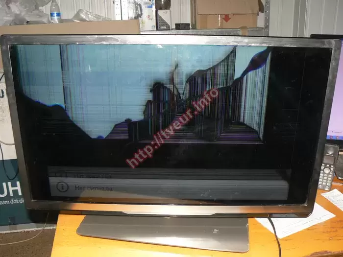 В ходе выполнения диагностики ЛЕД телевизора стало понятно, что наряду с разбитым экраном, сломанным оказался разъем. В месте удара на экране образовалась небольшого размера дырка и глубокие длинные трещины, чем-то напоминающие цветок. Здесь же многочисленные вертикальные и горизонтальные цветные полосы. Верхняя часть матрицы светлая, нижняя черная. Вдоль нижней рамки серая полоса и часть заставки «Нет сигнала», которая двоится.
