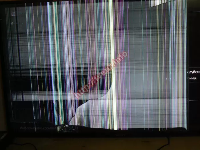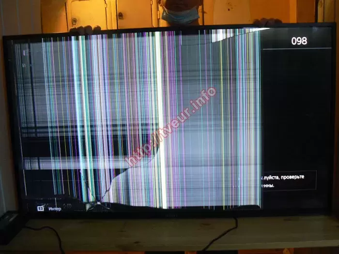 По причине того, что телевизор упал на тумбу матрицей вниз, на ней много разных механических повреждений. Немного левее логотипа Sony дырка, причем достаточно большого размера. От нее пошли трещины в разные стороны, одна из которых очень длинная и заканчивается практически возле верхней рамки. Большая часть экрана в цветных вертикальных и горизонтальных полосах. Справа широкая темная полоса и осталась видна часть заставки, сверху тонкая горизонтальная полоса белого цвета и число 098. Для выполнения диагностики пришлось подключить телевизор от нашего блока питания. В ходе ее выполнения выяснили, что необходима только замена матрицы Sony, поскольку остальные компоненты при падении не пострадали.