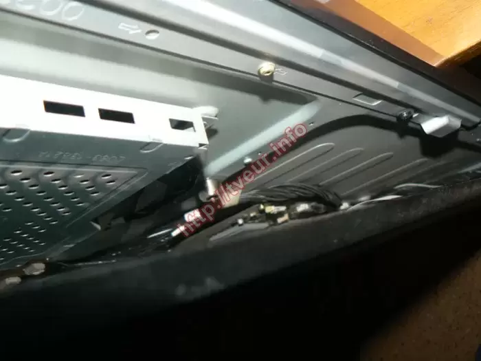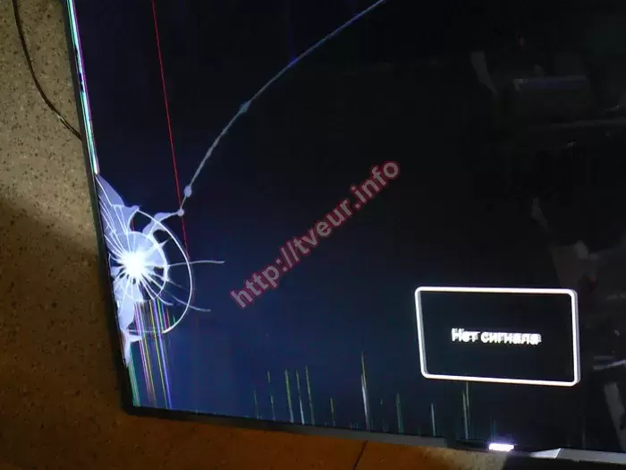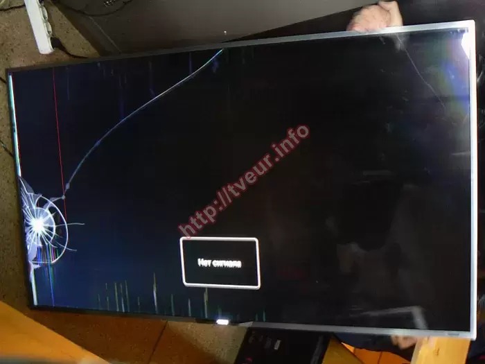 Первоначальный осмотр показал, что по причине падения на матрице возле левой боковой рамки образовался большого размера светящийся скол. Вокруг скола несколько круговых трещин, а также много мелких трещин, которые расходятся в разные стороны. Между круговыми трещинами экран серого цвета, что указывает на то, что в этом произошло отслоение матрицы. Около боковой рамки видна широкая светлая полоса, между трещинами множество цветных линий с разной длиной. Также одна достаточно длинная трещина проходит через всю матрицу. Над логотипом Philips видна заставка «Нет сигнала». В ходе диагностики мастер установил, что вместе с вышедшей из строя матрицей на задней крышке часть крепежей сломана. Внутренние детали телевизора, такие как, платы, LED подсветка, шлейфы полностью в рабочем состоянии. Исходя из этого, необходимо только купить матрицу для телевизора Philips и выполнить замену. Результаты диагностики и ориентировочную цену ремонта сообщили заказчику, который согласился на его выполнение.