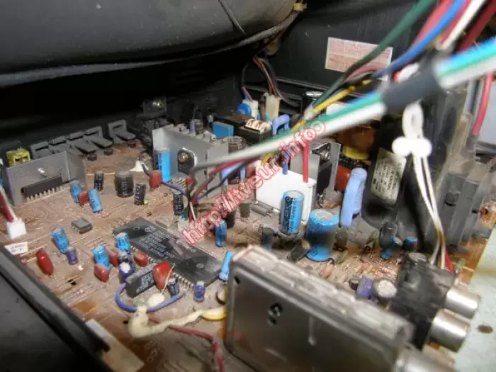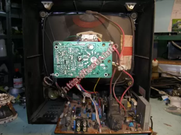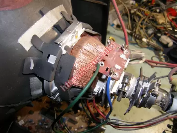 Не работает отклоняющая система кинескопа, телевизор не включается. Проблема в пробитой строчной отклоняющей катушке кинескопа. Ремонт телевизоров состоял в ее замене на рабочую, а так же резистора (100 кОм) в схеме строчной развертки.
