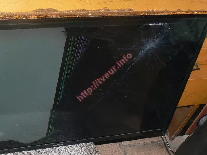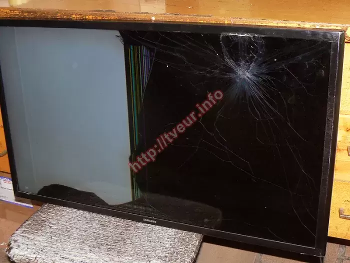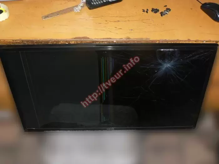 На экране современного жидкокристаллического телевизора Samsung Ue32J5200AW много механических повреждений, у него продавлена матрица, многочисленные трещины. Пользователь доставил ТВ в наш сервисный центр и попросил, чтобы была сделана срочная замена разбитого экрана телевизора. Эта модель с 32-дюймовым LED экраном, наделена такими прогрессивными функциями, как Wi-Fi и Smart TV. Применение инновационной технологии по расширению диапазона цветопередачи «Wide Color Enhancer Plus» в полной мере улучшает качество картинки. Благодаря HDMI разъемам (2 штуки), этот телевизор превращается в полноценный домашний центр развлечений. Преимущество данных разъемов состоит в том, что посредством одного кабеля в ТВ одновременно можно передавать сигнал видео и звука, причем высочайшего качества с любых устройств, которые поддерживают этот интерфейс. Осмотрев устройство стало понятно, что замена разбитого экрана телевизора станет обязательной, так как в результате удара по нему, в верхнем правом углу небольшого размера вмятина, во все стороны пошли многочисленные трещины разной длины, чем-то напоминающие цветок. Еще много трещин по всему экрану (отлично видно на фото № 2). Матрица очень сильно разбита, визуально она как бы разделена на две половины, правая ее сторона черного цвета, остальная часть - серого. Между ними образовались вертикальные, разной длины цветные полосы. С такими повреждениями телевизор работать не будет, соответственно заказана и заменена новая матрица нужной модели и диагонали.