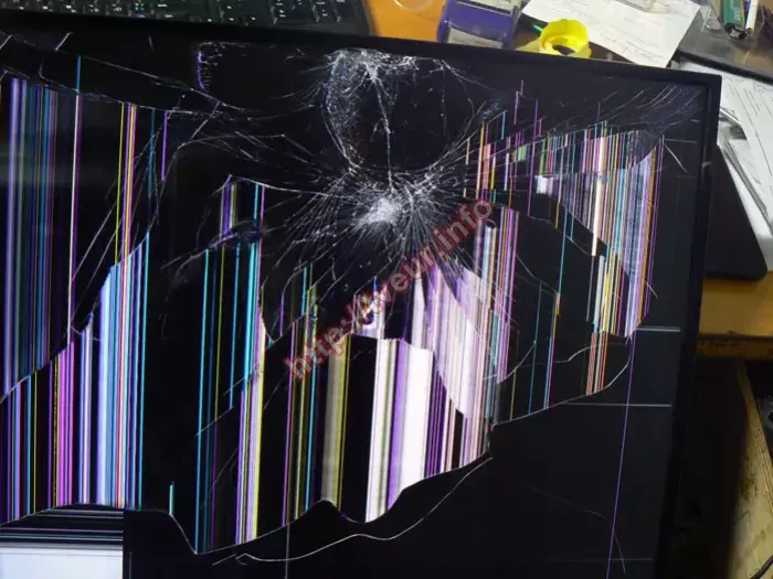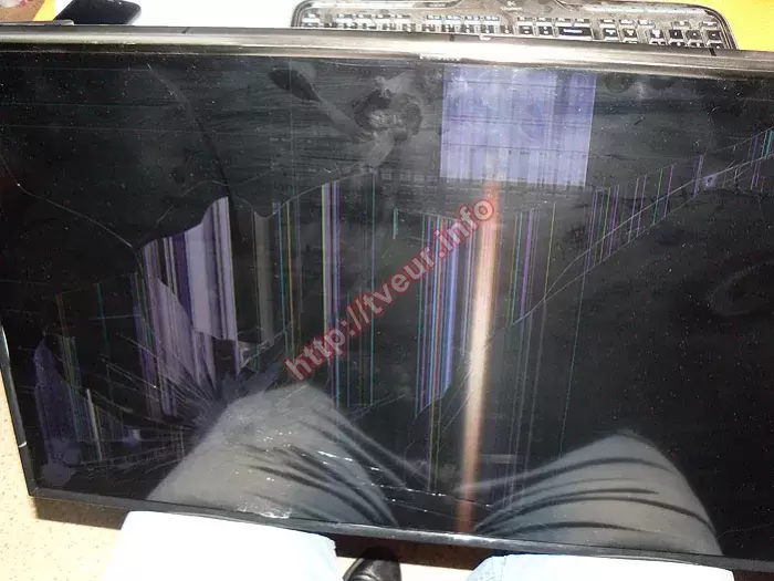 В результате падения с высоты матрица телевизора в многочисленных механических повреждениях, изображение сильно затемнено. В месте, куда пришелся основной удар, появилось огромное количество мелких трещин. В основном они сосредоточены возле верхней рамки посередине и чуть ниже. Также по экрану есть тонкие длинные трещины. Между трещинами многочисленные вертикальные цветные линии разной длины и ширины. Возле нижней рамки преобладают вертикальные столбцы белого цвета, а около логотипа появилось светлое пятно в виде квадрата, на котором также просматриваются линии. Остальная часть экрана черная. Такие «симптомы» указывают на то, что замена матрицы LED телевизора неизбежна.