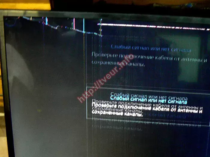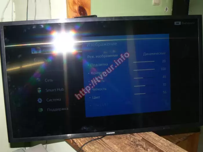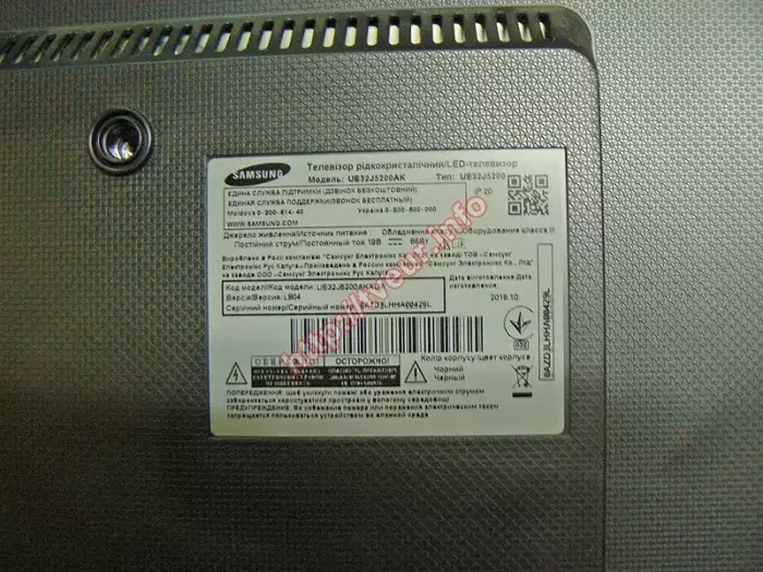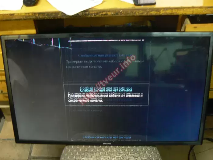 32-дюймовый (81 см) ЖК телевизор Samsung UE32J5200AK поступил в сервисный центр по причине того, что у него разбита матрица. Данная модель доставлена в чужой коробке от телевизора LG вместе с блоком питания и шнуром. Телевизор достаточно современный, он собран в 2016 году и поддерживает такие функции, как SmartTV, DVB-T2, LED, Wi-Fi, Ethernet. Заказчику требуется срочная замена матрицы телевизора Самсунг 32-дюйма, которая по неосторожности разбита. С его слов стало понятно, что удар пришелся в левый верхний угол. И хотя, как утверждает пользователь, он бы не сильным, но в этом месте сразу же образовалась небольшая дырочка, вокруг которой круг синего цвета. Здесь же появилась не большая цветная трещина, напоминающая пунктирную. От трещины вверх пошли вертикальные разноцветные полоски. Вдоль верхней рамки посередине белая горизонтальная линия, которая тоже пунктирная. Вся середина матрицы в еле просматривающихся линиях. Над логотипом Самсунг, посередине и вверху осталась светиться заставка, которая двоится. Остальная часть экрана осталась не поврежденной. Чтобы стала возможной замена матрицы телевизора Самсунг 32-дюйма, необходимо было заказать и купить новую панель, которая бы полностью отвечала той, которая разбита. Это удалось сделать, после чего была снята испорченная деталь и выполнена результативная замена, которая обошлась намного дешевле нового телевизора. На ремонт + деталь выдана гарантия.