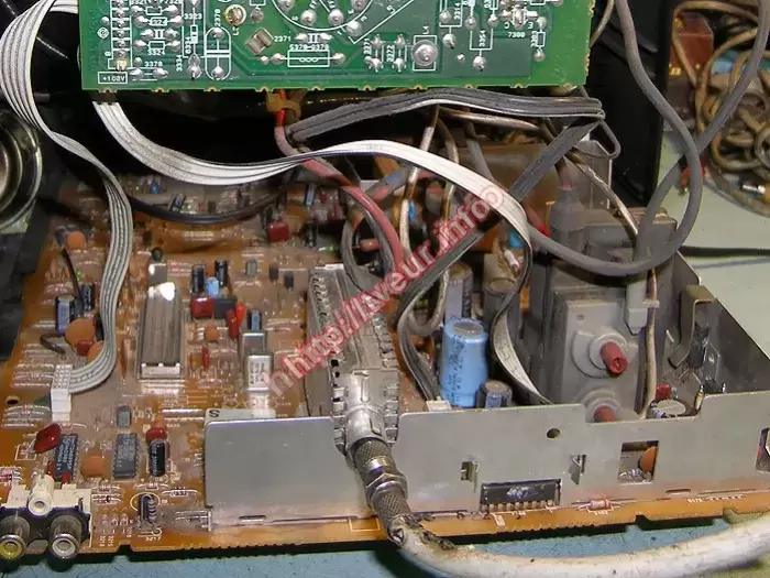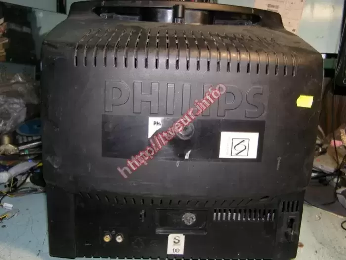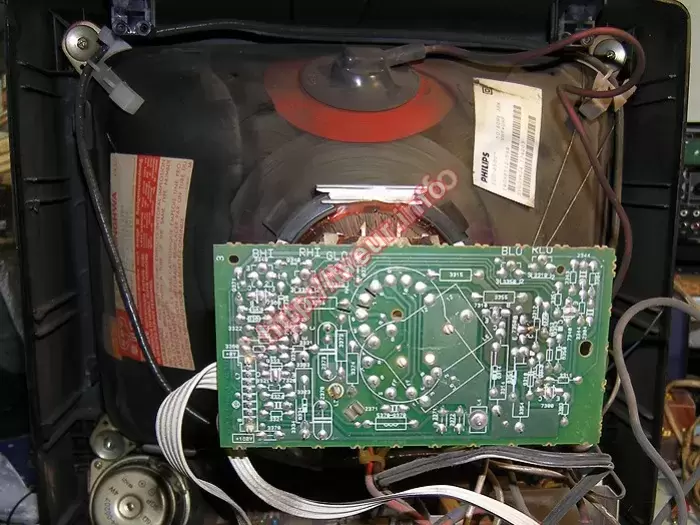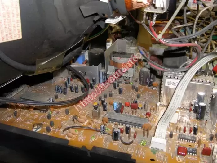 Копаный кинескопный ТВ, который падал, с трещинами в плате шасси попал в ремонт телевизоров с диагнозом: не включается, мигает светодиод. Частая проблема, которая потребовала ремонт блока питания и восстановление монтажа платы шасси.