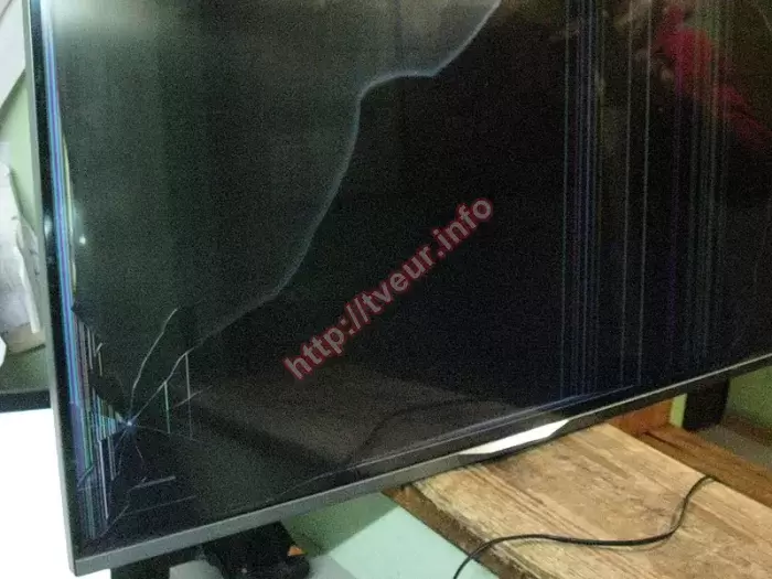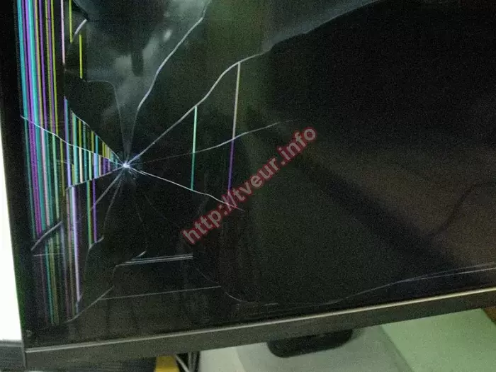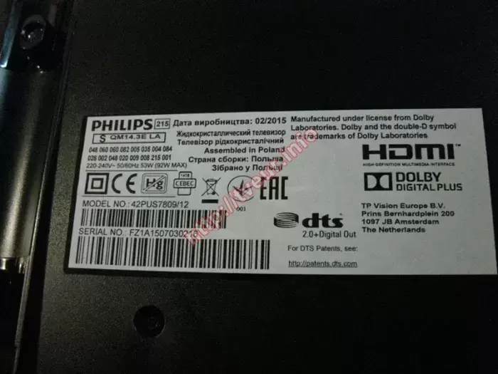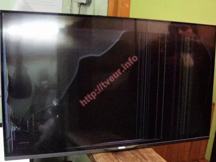 В ультратонком Smart 4К LED телевизоре Philips 42PUS7809/12 разбит большой 42-дюймовый экран. С такой неисправностью может быть выполнена только замена матрицы телевизора, которая будет дорогой. Данная модель выпущена в 2015 году (страна изготовитель Польша), о чем свидетельствует наклейка на задней крышке телевизора. Устройство отличается высоким разрешением 3840x2160 Ultra HD, частота развертки экрана составляет 600 Гц. Этот телевизор с поддержкой таких современных функций, как 3D (очки в комплекте), Smart-TV и Wi-Fi. Суммарная мощность звука составляет 25 Вт. Осмотрев устройство стало понятно, что в результате удара, который пришелся в нижний левый угол, через весь экран пошли трещины. Особенно их много, непосредственно в месте самого удара. Там же появилось много вертикальных небольших по размеру, цветных полос. Кроме того, вертикальные полосы видны в правой части матрицы, которая вся черного цвета. Правый верхний угол и до середины более светлого цвета. Такого рода проблемы возникают, как показывает практика, по вине самих пользователей, которые не аккуратно обращаются с такой сложной техникой. В результате была заказана и заменена новая матрица, сделаны настройки, после чего телевизор полностью рабочий. Чтобы избежать подобной ситуации, которая обошлась пользователю достаточно дорого, рекомендовано беречь экран от ударов, не допускать попадания под матрицу какой-либо жидкости.