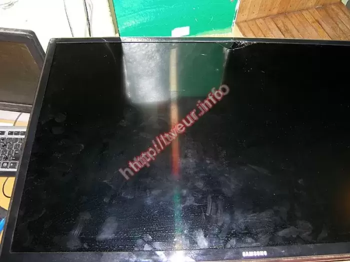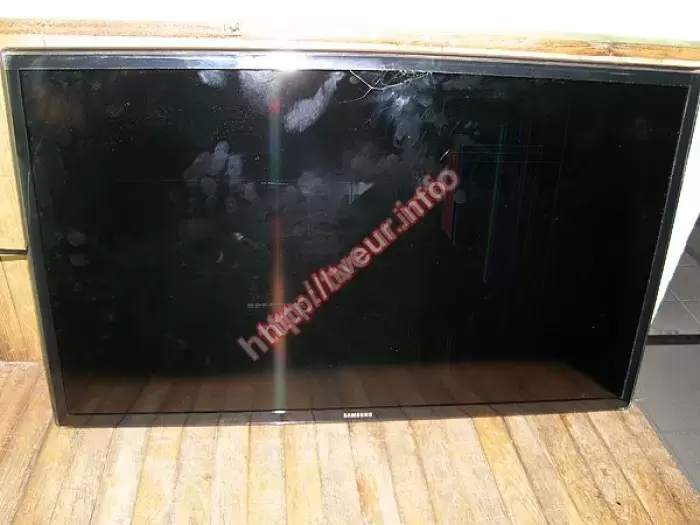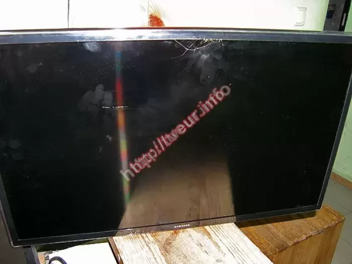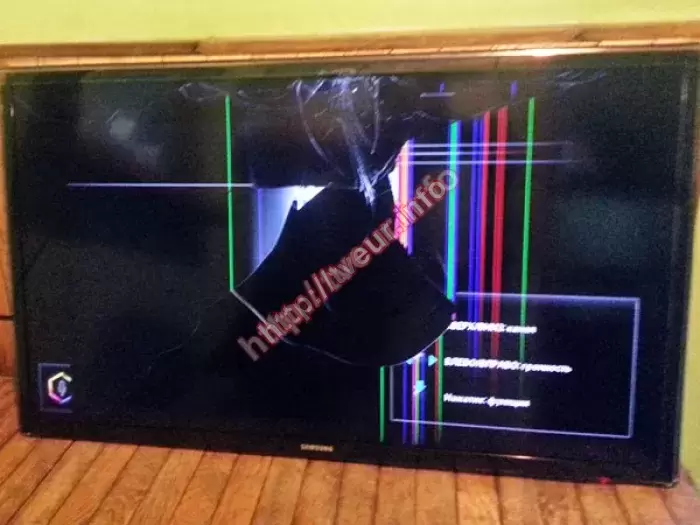 В результате попадания в ТВ тяжелым предметом разбита матрица, появились трещины и большие разноцветные вертикальные полосы. Замена матрицы телевизора - недешевое удовольствие, но все же в разы дешевле, чем покупка нового устройства.