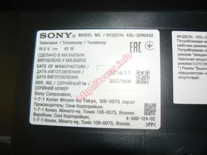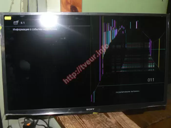 32-дюймовый LED телевизор Sony KDL-32RD433, который изготовлен в 2016 году в Японии, поступил в сервисный центр с неисправностью - сильно разбита матрица. Заказчик попросил срочно поменять экран телевизора. Данная модель с частотой обновления 200 Гц (MotionFlow), углами обзора 178°/178°, а также широким набором поддерживаемых аудио и видео форматов. Во время предварительного осмотра стало понятно, что экран очень сильно испорчен, поскольку по нему был удар. От места удара (ближе к верхней рамке) во все стороны появились трещины разной длины, некоторые из которых через всю матрицу. Между трещинами многочисленные разноцветные полоски тоже разной длины и ширины. Они присутствуют практически до середины матрицы. Кроме того в районе удара, чуть ниже образовалось растровое пятно из вертикальных и горизонтальных линий. Остальная часть экрана черного цвета (отлично видно на фото № 3). В целом телевизор в хорошем состоянии, ранее он не ремонтировался и не вскрывался. На задней стенке имеются все необходимые этикетки с информацией о данной модели, они хорошо читабельные. С такой неисправностью возможно только поменять экран телевизора, который необходимо купить, причем нужной модели и диагонали. В результате разбитая панель была демонтирована, вместо нее поменяна новая, сделаны все настройки. Изображение отличного качества. Заказчику выдана гарантия.