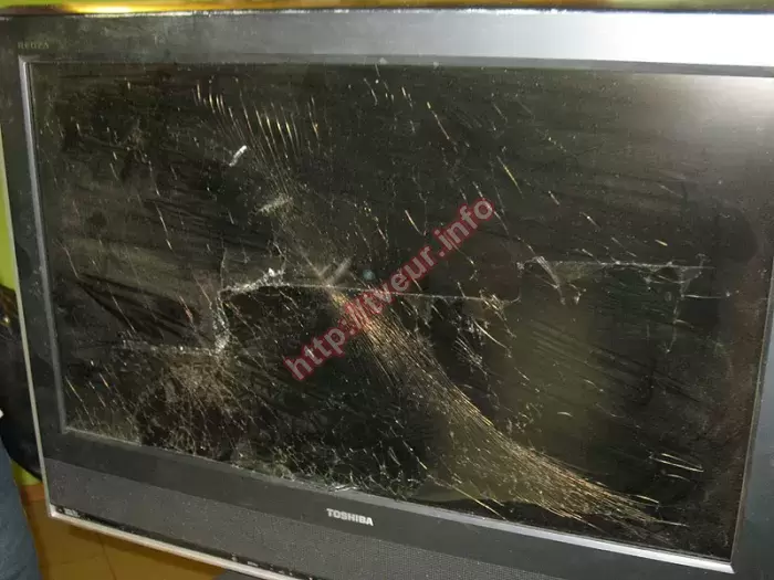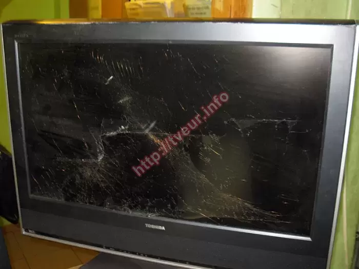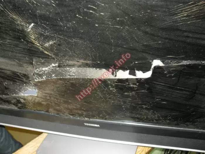 Если на экране современного ТВ видны трещины, появились сколы, разноцветные полоски или другие механические повреждения, которые как правило появляются в результате падения или удара, потребуется гарантированно замена матрицы телевизора, выполнить которую можно в сервисном центре. В данном случае по причине сильного удара по экрану 26-дюймового (66 см) LCD телевизора Toshiba 26WL66R на нем появились многочисленные мелкие трещины. Ними покрыт практически весь экран. Посередине видна толстая зигзагообразная трещина, вниз от которой «паутина» мелких трещин (отчетливо видно на фото № 3). Чуть меньше трещин в верхнем правом углу, при этом замены матрицы телевизора избежать не получится. Этот ЖК телевизор наделен прогрессивной разверткой, поддержкой телевизионных стандартов PAL, SECAM, NTSC, а также объемным звучанием, которое достигается, благодаря двум динамикам по 10 Вт каждый. Телевизор может похвастаться наличием современных разъемов, в число которых входит HDMI. Такой ремонт, когда требуется замена экрана является достаточно сложным, причем, чем большей диагонали матрица, тем он сложней. Чтобы его выполнить телевизор необходимо полностью разбирать, аккуратно демонтировать разбитый экран, и только потом установить новый. После всех вышеописанных работ, которые выполнялись опытным телемастером, сделаны все соответствующие настройки. Беречь от ударов в дальнейшем!