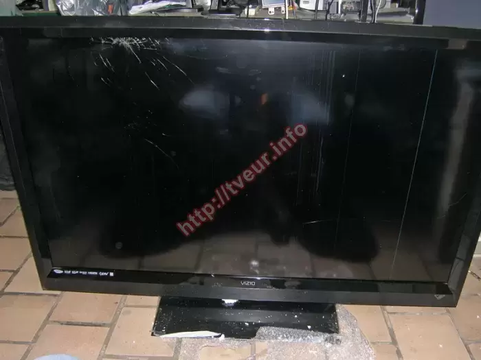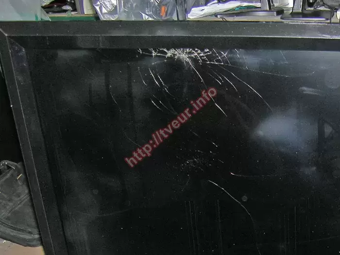 Такие ремонтные работы, как замена матрицы телевизора с любой диагональю, является достаточно сложным процессом, потому должны выполняться опытными телемастерами, работающими в специализированных мастерских. Как правило, замена выполняется в тех случаях, когда на хрупком экране появляются трещины, другие механические повреждения, когда под матрицу попадает вода. В данном случае по 55-дюймовой матрице телевизора Vizio E550VL по неосторожности ударили каким-то предметом, в результате в месте удара (не далеко от верхней рамки слева) появилось множество мелких трещин. Кроме того, тонкие трещины разошлись вдоль всего экрана (можно увидеть на фото № 2). Наряду с трещинами, на матрице много разноцветных вертикальных полос разной ширины и разной длины. Данные симптомы говорят о том, что без замены матрицы телевизора в данном случае обойтись не возможно. Поскольку она большой диагонали, ремонт будет не простым. Более того, он будет достаточно дорогостоящим, поскольку ЖК матрица является самой дорогой составляющей в современном телевизоре. При выполнении таких восстановительных работ имеется своя специфика, так как вначале необходимо правильно разобрать телевизор и максимально аккуратно демонтировать разбитую матрицу, только потом установить новую. После всех вышеописанных работ и окончательных настроек, телевизор Vizio E550VL полностью в рабочем состоянии. Эксплуатировать телевизор в дальнейшем правильно, беречь от падений и ударов!