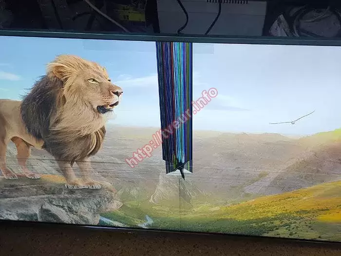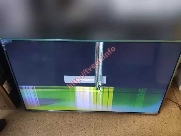 Как оказалось, по матрице ударили достаточно сильно, так как на ней появилась дырка, от которой короткие трещины. От этого места вверх вертикальный столбец, который насчитывает много линий разных цветов. Кроме того, видны горизонтальные полосы. Верхняя часть экрана темного цвета, нижняя в многочисленных разноцветных столбцах, которые пересекают горизонтальные полосы. Посередине осталась светить заставка. В ходе диагностики установили, что при ударе пострадал только экран, поэтому потребуется замена ЖК матрицы телевизора, все остальные компоненты в исправном состоянии.