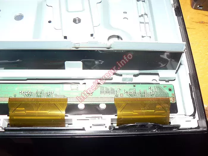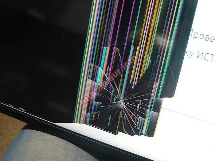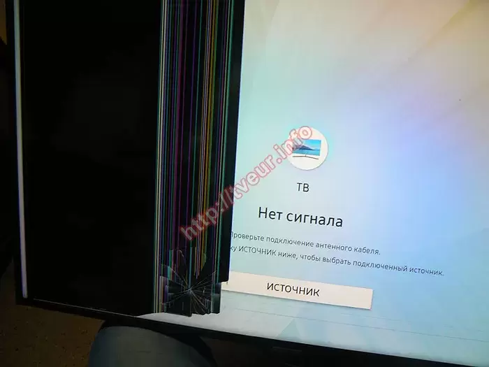 При осмотре выяснили, что там, куда пришелся удар образовалась дырка небольшого размера, от нее короткие трещины в разные стороны, а также столбец, состоящий из многочисленных цветных вертикальных полос. Правая сторона матрицы с остатками изображения, осталась светиться заставка «Нет сигнала. Проверьте подключение антенного кабеля....». Две еле просматривающиеся горизонтальные линии под заставкой «Источник». Для того, чтобы стала возможной диагностика для телевизора его полностью разобрали, что позволило определиться со стоимостью ремонта по замене матрицы. Результаты диагностики для телевизора сообщили клиенту, который изучив все за и против, все же решил выполнять ремонт.
